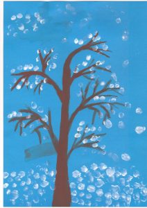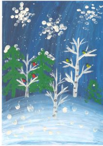 В своих работах дети на листе бумаги с помощью красок выразили свои представления о зиме, зимних развлечениях, прогулках, забавах, нетрадиционным способом рисования. Ребята рисовали пальчиками, ладошками, ватными палочками, оттиском поролона, солью и клеем , рисованием по точкам, набрызгами и другими интересными способами.